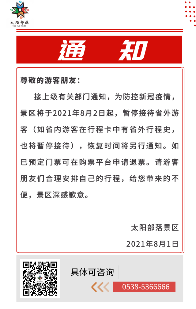 通知:為防控新冠疫情,太陽(yáng)部落將于8月2日起暫停接待省外游客