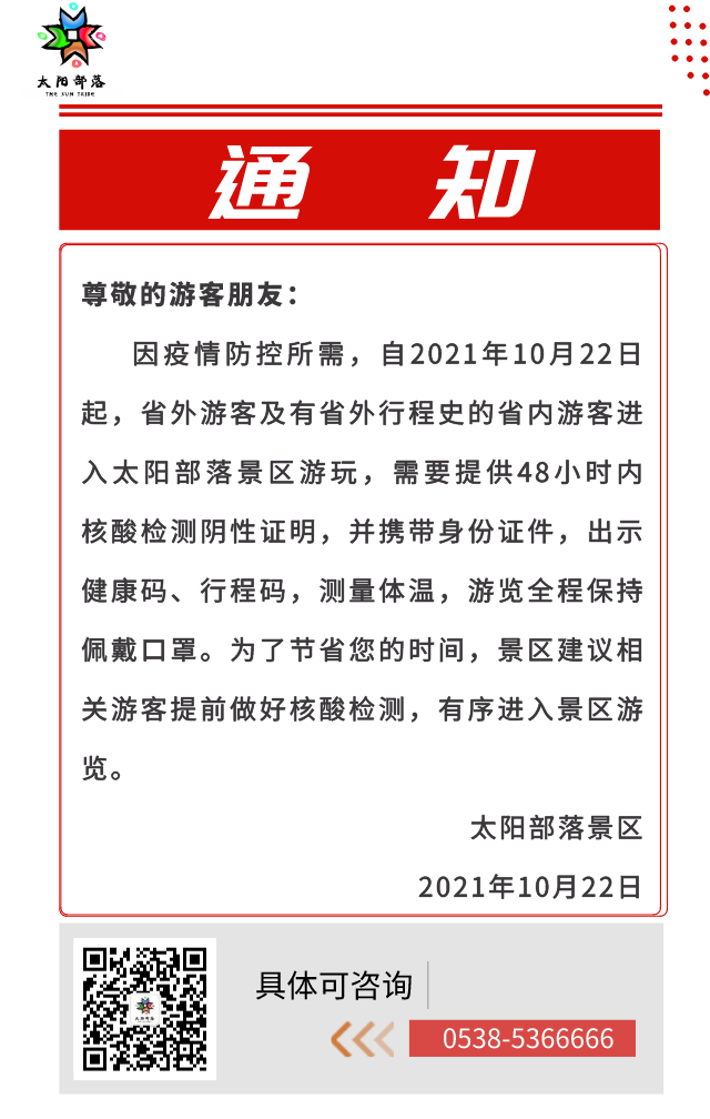 提醒!省外游客參觀(guān)太陽(yáng)部落景區須持48小時(shí)內核酸陰性證明!